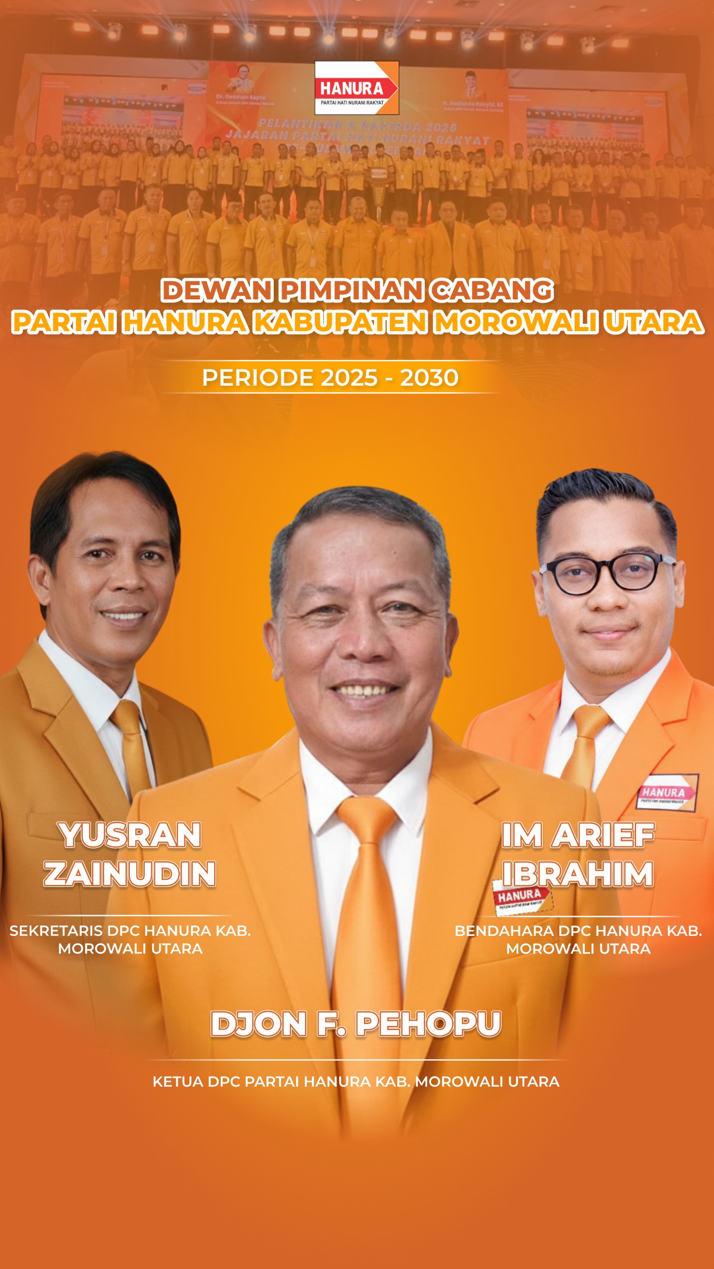 Dalam kepengurusan tersebut, Djon F. Pehopu dipercaya sebagai Ketua DPC HANURA Morowali Utara, Yusran Zainudin sebagai Sekretaris, dan IM Arief Ibrahim sebagai Bendahara untuk masa bakti kepengurusan periode terbaru.